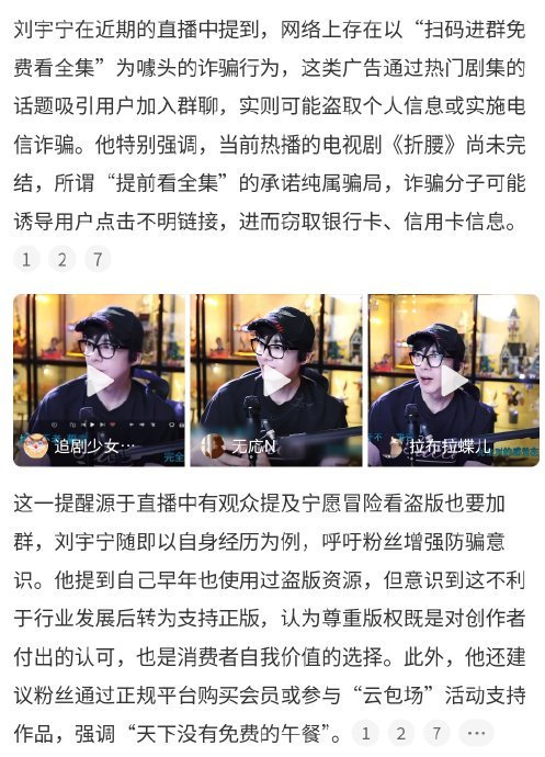 2025年5月直播中,刘宇宁提及“开会员不会影响生活”被断章取义为“何不食肉糜”,实际原意是呼吁支持正版并揭露盗版骗局。主流媒体随后发声支持,肯定其“版权保护是必答题”的立场。