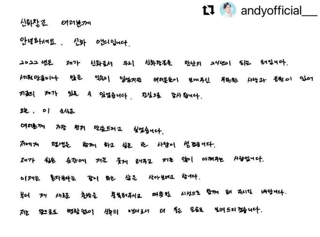 부디 제 새로운 출발을 축복해주시고 따뜻한 시선으로 함께 해 주시길 바랍니다.저는 앞으로도 변함없이 신화의 앤디로서 더 좋은 모습을 보여드리겠습니다.