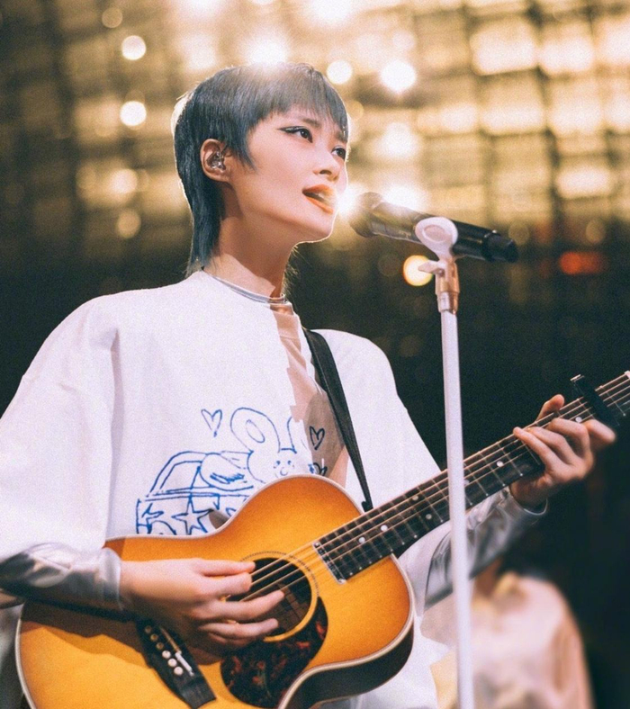 一身很有六十年代风格,非常复古的造型,重新定义了时尚。而在零点的时候,她又拿起吉它给大家伴奏。
