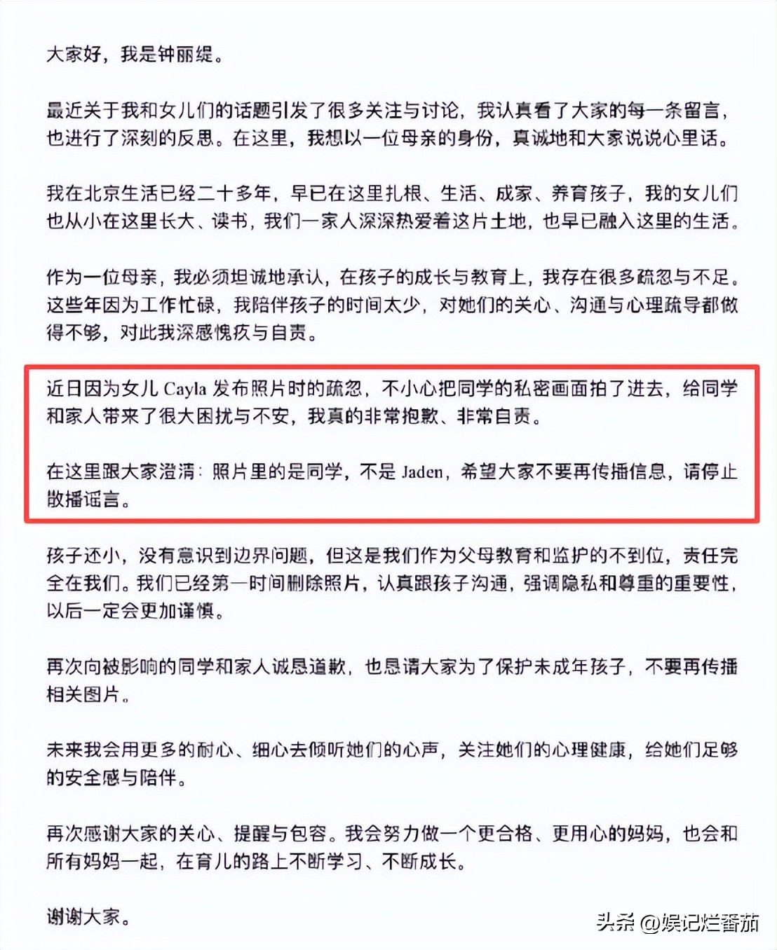 最终以孩子还小的理由希望大家不要再散播谣言。
