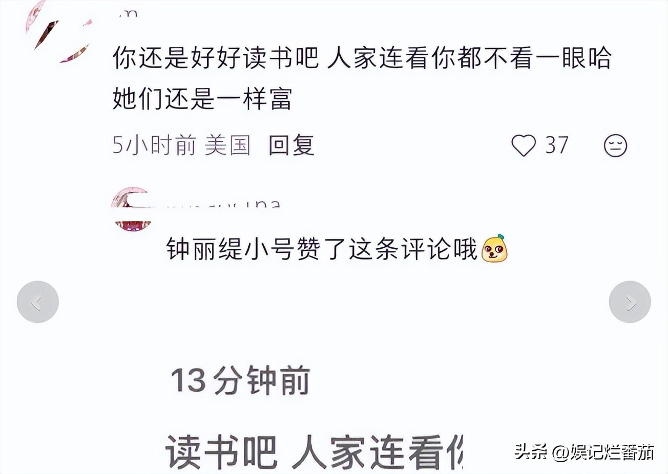 早在之前,一名网友出面替他们一家说话,说“你还是好好读书吧,人家连看都不看你一眼”,这条评论被扒出来,钟丽缇的小号点过赞。