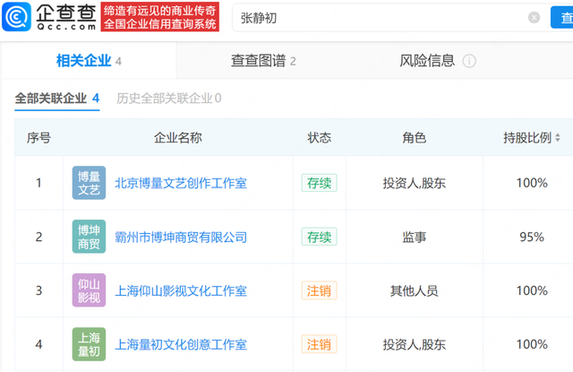 查询企查查发现,张静初名下共关联4家公司,仅霸州市博坤商贸有限公司、北京博量文艺创作工作室为存续状态,其余两家个人独资工作室已注销。值得注意的是,2024年7月,霸州市博坤商贸有限公司因未按规定公示年度报告被河北省廊坊市霸州市市场监督管理局列入异常经营名录。