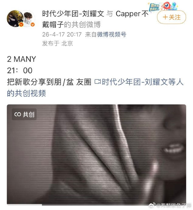 **吃瓜简评:刘耀文的《2 MANY》预告,打破偶像规则,点燃粉丝狂欢**,2026年4月17日,微博互关事件中,时代少年团成员刘耀文与说唱歌手Capper的“关”后,引发全网热议,而当晚同步空降的新歌《2 MANY》预告视频,以一场精心设计的“时空密语”点燃了粉丝的狂欢,这场跨界合作不仅是一次音乐合作,更是一场精心策划的粉丝互动表演,充满了艺术性与深意。,### 1. **极简画面,暗藏玄机:16秒视频的信息风暴**,预告视频仅16秒,却暗藏多重信息,刘耀文身穿黑色连帽卫衣,在冷暖交织的光影中凝视镜头,未发一言,却以浓郁的苏感氛围引爆话题,画面结尾定格于“2 MANY”歌名及发布时间“21:00”,配文“把新歌分享到朋/盆友圈”,这句被粉丝解读为对合作对象Capper的嘻哈文化表达习惯的一种呼应。,### 2. **时空密语:从2017到2026的九年时光**,发布时间的设计更是充满玄机: ,- **时间密码“20:17”**:预告发布于4月17日20:17,精准对应刘耀文2017年正式公开亮相的年份,粉丝发现,两天前(4月15日)他同样选择20:17发布“依旧没有不帅的义务”图文,并评论自己2017年的第一条微博,形成时空闭环。 ,- **歌名玄机“2 MANY=TO满月”**:谐音直指粉丝群体“满月”,象征从2017到2026年长达九年的陪伴。 ,### 3. **互关事件:跨圈联动的艺术前奏**,新歌预告与微博互关形成深度捆绑: ,- **互关即官宣**:当日20:01,新浪音乐率先发布二人互关消息,#刘耀文capper微博互关#话题登上热搜,两人账号状态同步更新为“已关注”,打破偶像与嘻哈圈的壁垒。 ,- **共创视频的隐藏线索**:合作预告采用“共创视频”形式发布,Capper标志性的帽子emoji(????)与刘耀文“盆友圈”的趣味文案,暗示音乐风格的碰撞融合。 ,### 4. **细节控的浪漫:粉丝文化的双向奔赴**,刘耀文将粉丝文化编码嵌入每个环节: ,- **宇宙闪烁的伏笔**:4月15日他主动评论粉丝创作的“宇宙闪烁”博文,因新歌合作伙伴Capper曾参与该主题内容,被解读为埋梗互动。 ,- **熬夜打磨的诚意**:据合作方透露,刘耀文为准备新歌舞蹈版拍摄至凌晨四点,高强度工作只为呈现完美舞台。 ,### 5. **音乐进化论:从SAUCE到2 MANY的突破**,此次合作延续了刘耀文的先锋实验精神: ,- **全英文创作新尝试**:继个人单曲《SAUCE》以全英文歌词、工业美学震撼市场后,《2 MANY》再度探索国际化曲风,EDM Trap基底融合嘻哈元素。 ,- **符号化视觉语言**:连帽卫衣的日常感与光影的高级感对冲,延续其“将生活符号升华为艺术概念”的审美体系,媲美奢侈品大片质感。 ,### 6. **一场粉丝狂欢的艺术表达**,当《2 MANY》在21:00准时响起,这场始于微博互关的音乐行为艺术完成了它的终极表达——时间刻度成为情怀载体,镜头切换传递美学革命,而少年卫衣帽檐下的深邃目光,已然刺破偶像工业的规则穹顶,这不是一次简单的单曲发布,而是Z世代音乐人用代码级浪漫书写的成长宣言:在钢铁时代,用黄金般的真心再造纪元。## 刘耀文的"时空密语":一场关于粉丝的饕餮盛宴,在这个信息爆炸的时代,偶像与粉丝之间的互动早已超越了简单的粉丝福利,演变成了一场精心设计的文化饕餮盛宴,2026年4月17日的夜晚,刘耀文选择了一场极具艺术性的互动方式——在微博上与说唱歌手Capper互关,这一举动不仅打破了偶像与嘻哈圈的壁垒,更点燃了一场关于粉丝的全网狂欢。,预告视频仅16秒,却暗含多重信息,刘耀文身穿黑色连帽卫衣,在冷暖交织的光影中凝视镜头,未发一言却以苏感氛围引爆话题,画面结尾定格于白色字体的歌名《2 MANY》及发布时间"21:00",配文"把新歌分享到朋/盆友圈",后者被粉丝解读为呼应合作对象Capper的嘻哈文化表达习惯,这一细节的设计,恰到好处地将粉丝文化融入音乐创作的每个环节。,更值得玩味的是发布时间的设计。"时间密码'20:17'":预告发布于4月17日20:17,精准对应刘耀文2017年正式公开亮相的年份,粉丝发现,两天前(4月15日)他同样选择20:17发布"依旧没有不帅的义务"图文,并评论自己2017年的第一条微博,形成时空闭环,这种精心设计的时空密语,打破了线上线下的界限,让粉丝感受到一种超越时间的羁绊。,"歌名玄机'2 MANY=TO满月'":谐音直指粉丝群体"满月",象征从2017到2026年长达九年的陪伴,这个谐音打出的符号,不仅是一个音乐作品的命名,更是一份情感的承诺,刘耀文用最简洁的方式,将九年与粉丝的陪伴完美地串联起来。,新歌预告与微博互关形成深度捆绑,当日20:01,新浪音乐率先发布二人互关消息,#刘耀文capper微博互关#话题登上热搜,两人账号状态同步更新为"已关注",打破偶像与嘻哈圈的壁垒,更有创意的是,合作预告采用"共创视频"形式发布,Capper标志性的帽子emoji(????)与刘耀文"盆友圈"的趣味文案,暗示音乐风格的碰撞融合。,刘耀文将粉丝文化编码嵌入每个环节,从4月15日他主动评论粉丝创作的"宇宙闪烁"博文,因新歌合作伙伴Capper曾参与该主题内容,被解读为埋梗互动;到据合作方透露,刘耀文为准备新歌舞蹈版拍摄至凌晨四点,高强度工作只为呈现完美舞台,这些细节都在向粉丝传递着一种真诚与用心的信息。,此次合作延续了刘耀文的先锋实验精神,全英文创作新尝试,EDM Trap基底融合嘻哈元素,打破了以往的音乐框架,连帽卫衣的日常感与光影的高级感对冲,延续其"将生活符号升华为艺术概念"的审美体系,媲美奢侈品大片质感,这些创新不仅是音乐上的突破,更是艺术表达的升华。,当《2 MANY》在2
