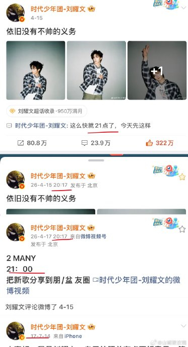 - 时间密码“20:17”:预告发布于4月17日20:17,精准对应刘耀文2017年正式公开亮相的年份。粉丝发现,两天前(4月15日)他同样选择20:17发布“依旧没有不帅的义务”图文,并评论自己2017年的第一条微博,形成时空闭环。