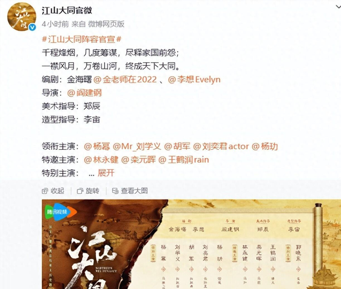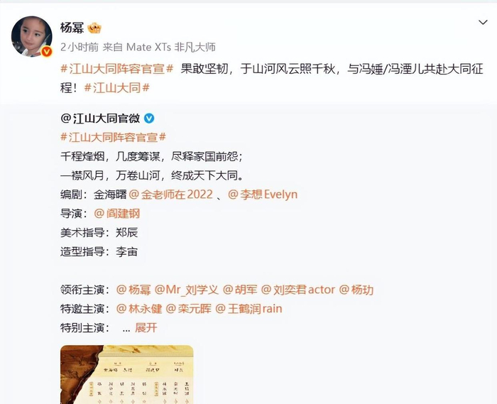 3月30日,重大历史题材电视剧《江山大同》正式官宣全阵容,杨幂的名字赫然在列。