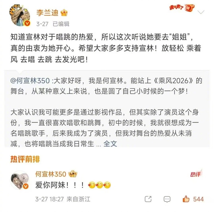 #李兰迪回应何宣林wink# @何宣林 专属wink就已经甜度拉满了,@李兰迪 一句“乘着风踏着浪去向更高处”,完完全全就是我们所有观众的心声啊!相信她即将苦尽甘来了。#乘风直播##乘风2026#