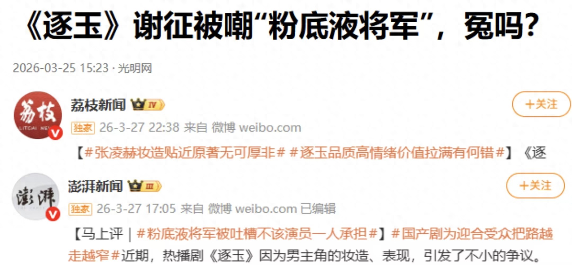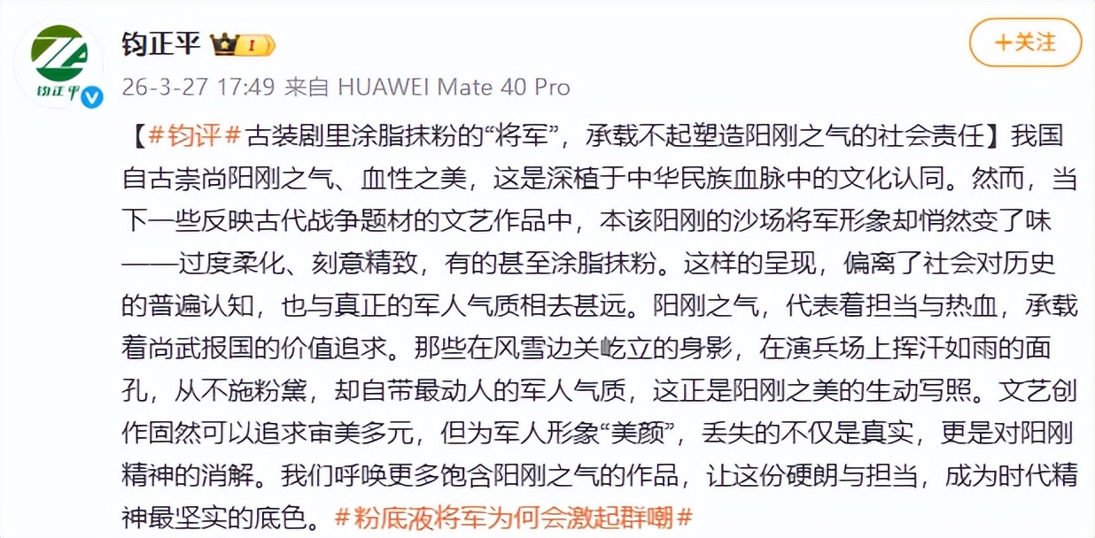 3月27日,解放军官方媒体“钧正平”发文评论,虽未点名道姓,但文中“古装剧里涂脂抹粉的‘将军’,承载不起塑造阳刚之气的社会责任”的表述,直指当下影视圈的病态审美,批评部分作品中武将形象过度柔化、刻意精致,偏离了历史认知与军人气质。