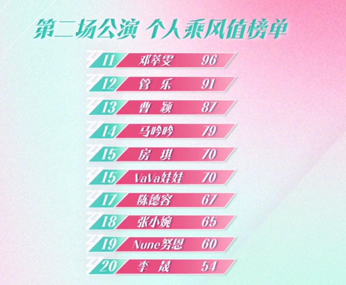 排名第11-20的姐姐,分别是邓萃雯、管乐、曹颖、马吟吟、房琪、VAVA、陈德容、张小碗、努恩、李晟。