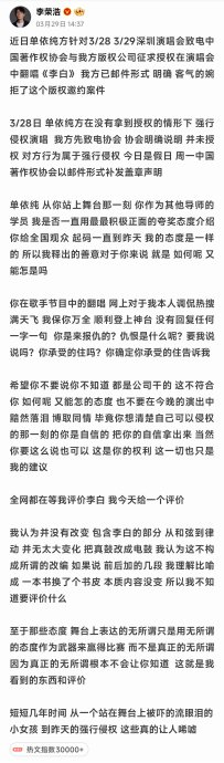 **李荣浩的四连质问:一场版权与艺德的“吃瓜”大戏**,2026年3月29日,音乐人李荣浩在社交媒体上以四连质问的方式直指歌手单依纯未经授权翻唱其原创作品《李白》,这场围绕版权、艺德与行业规则的公开对峙,瞬间点燃全网热议,作为音乐制作人和版权方,李荣浩的举动不仅仅是对单依纯的质问,更是一次对整个行业规则和艺德底线的深度叩问。,### **事件背景:版权侵权的“明知故犯”**,李荣浩在社交媒体上发布长文,首次发难的时间是3月29日的下午两点37分,他明确指控单依纯团队在深圳演唱会前已向中国音乐著作权协会及其版权公司申请翻唱《李白》的授权,但遭到邮件婉拒,然而就在3月28日的演唱会当晚,单依纯仍强行登台演唱该曲,她还在演唱会后公开出具了音著协当日13:48的官方声明邮件,清晰标注“未就该作品发放任何授权”,坐实侵权行为。,### **四连质问:层层递进的逻辑拷问**,李荣浩在第二次发声(16:42)中提出了引发全网轰动的四连质问:,1. **立场**:质疑单依纯既非版权方,又未获授权,法律与道德立场何在;,2. **权利**:依据《著作权法》,商业演出需获表演权许可,音著协已确认“强行侵权”;,3. **角度**:讽刺其改编仅“将真鼓改为电鼓”,本质如“换书皮”,无艺术创新;,4. **心态**:诛心质疑其“明知故犯”,甚至暗示“复仇动机”(“你是来报仇的?”)。,这些质问并非情绪宣泄,而是层层递进的逻辑拷问,堵死了单依纯团队可能的公关退路。,### **预判式反击:精准封堵公关选项**,李荣浩在首篇长文中精准预判单依纯团队可能的回应策略,并提前封堵:,1. **拒绝甩锅**:希望单依纯不要说“不知道,都是公司干的”;,2. **抵制卖惨**:不要在演出中黯然落泪博取同情,侵权时的自信请拿出来;,3. **揭露人设反差**:痛心单依纯从“舞台上流泪的小女孩”蜕变为“自信侵权者”。,### **冲突升级:历史积怨与行业拷问**,这场冲突背后不仅仅是版权纠纷,还有更深层次的历史积怨,李荣浩回溯对单依纯的长期提携:担任《中国好声音》导师时多次公开赞赏她,甚至在《歌手2025》节目容忍其颠覆性改编《李白》引发的全网调侃(如“如何呢?又能怎?”的洗脑歌词),选择沉默保全其声誉,然而此次商业侵权的“明知故犯”,彻底践踏其善意,导致他公开质问:“我释出的善意对你来说就是‘如何呢?又能怎?’吗?”,### **单依纯的模糊回应与舆论反弹**,面对指控,单依纯于16:16发布道歉声明,称“刚下彩排在了解情况”“会与团队核实”,并对李荣浩及受困扰者致歉,但该回应被批“避重就轻”:,1. **责任转嫁**:将问题归咎于团队流程,无视自身“演唱会总监制”身份;,2. **情感绑架**:感谢《李白》给我力量”被指虚伪,遭李荣浩反讽“侵权后致谢如同偷窃后夸赞物品好用”;,3. **时效性质疑**:声明与侵权发生间隔超24小时,“不知情”说辞难以服众。,### **行业反思:版权意识与创作尊严**,这场事件暴露了部分艺人漠视版权规则的现象,单依纯在道歉中自称“创作者”并强调“版权红线”,却回避“先申请被拒仍执意翻唱”的核心事实,凸显言行割裂,李荣浩的强硬维权获得多数网友支持,认为其“逻辑严密、直面问题”的态度为内娱树立标杆。,### **风波背后的结构性矛盾**,1. **流量逻辑侵蚀创作伦理**:单依纯团队被批陷入“黑红也是红”误区,以争议性改编博眼球,忽视原创者权益;,2. **行业授权机制漏洞**:音著协虽快速出具证明,但侵权仍发生,反映监管执行短板;,3. **代际价值观碰撞**:单依纯标榜的“如何呢?又能怎?”叛逆态度,从舞台人设延伸至对规则的轻蔑,引发对青年艺人责任感的质疑。,### **余波与启示:一场没有赢家的对峙**,事件以李荣浩“绝不妥协”的追责姿态与单依纯团队的沉默暂告段落,这场冲突撕开了华语乐坛的隐痛:,1. **对创作者**:维权需付出舆论战代价,李荣浩被少数观点批“不够体面”;,2. **对表演者**:单依纯的“天才少女”光环蒙尘,艺德遭公众审视;,3. **对行业**:2025年《人民日报》曾呼吁“包容青年文化表达”,但此次事件警示:包容不可逾越法律红线,创新不能践踏创作尊严,当“玩音乐”沦为“抢音乐”,所有人都将失去舞台的根基。,这场版权与艺德的“吃瓜”大戏,不仅揭示了行业内的深层矛盾,也为艺人在法律与道德之间的抉择发出了警示:在追求成功的路上,尊重他人创作的权益同样重要。