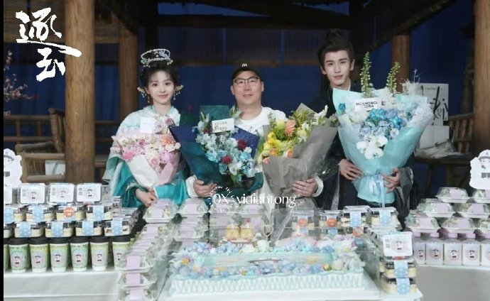 照片中三人并肩而立,张凌赫身着黑色戏服,田曦薇手持捧花笑容甜美,曾庆杰居中手持导演板,背景可见剧组庆祝横幅。该合照由认证账号“心有凌曦一点通”于今日发布,并配文“逐玉的故事圆满结束,我们不说再见”,同时关联话题#逐玉收官#、#逐玉张凌赫田曦薇曾庆杰杀青合照#,引发剧迷集体转发。