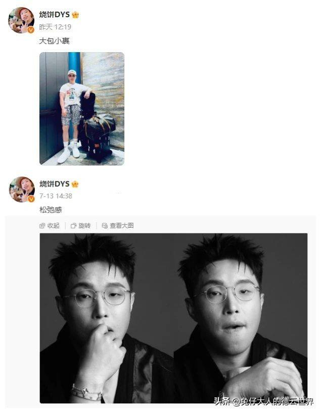 说烧饼要走帅哥路线,这也是有根据的。前几天,烧饼晒出的写真照和路拍,就是很好的佐证。烧饼的写真照,给人一种享受生活,享受人生的松弛感。第一张照片,烧饼身穿白色衬衣、白色裤子,套着一个黑色外套,给人一种很痞帅的既视感。第二张,是两张照片的对比。戴着金丝框眼镜,头发弄得很是有型。眼睛凝视着镜头,给人一种忧伤小王子的既视感。