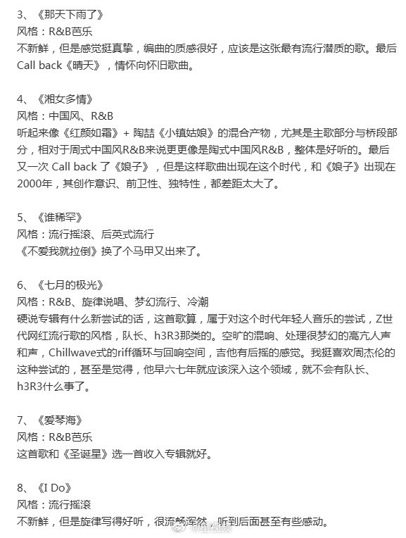 那么,专辑的其他部分呢?耳帝的批评指向了“配方老化”。他认为专辑多数歌曲像是旧作的“3.0、4.0版本”,缺乏突破性的音乐性。例如,《西西里》就被形容为《夜的第七章》《以父之名》《迷迭香》的“融合降级版”。整体创作逻辑,被他类比为陶喆之前的专辑《STUPID POP SONGS》——旋律依然流畅,但套路太过熟悉,惊喜欠奉。最终,耳帝给出了三星的评价(满分五星)。