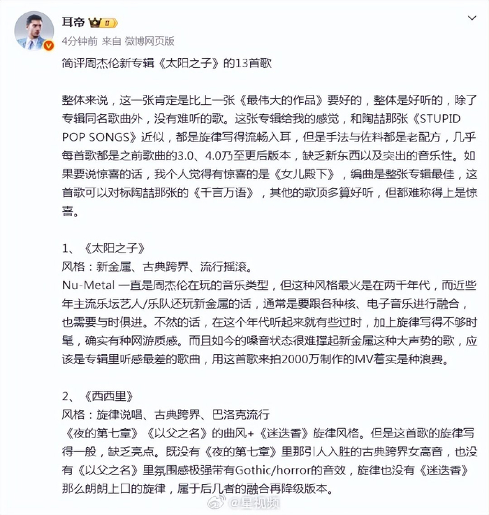 3月25日,知名乐评人耳帝的一篇长评,给周杰伦的新专辑《太阳之子》扔下了一颗“好听但不够炸”的评论炸弹。这篇评论迅速点燃了粉丝与乐迷的讨论,核心争议点直指那张号称耗资2000万打造的主打歌MV——在耳帝看来,这钱花得可能有点“冤”。