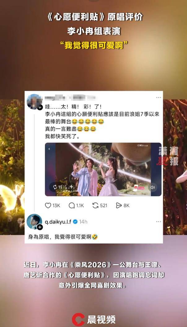 《心愿便利贴》的原唱本是元若蓝和吴忠明,如今吴忠明以一句“可爱”肯定了这次表演独特的娱乐性,也让这场因跑调而起的风波,最终变成了一场皆大欢喜的全民乐子。看来在舞台上,有时候极致的“不完美”,反而能碰撞出最真实的快乐火花。