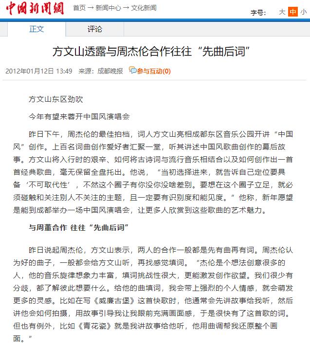 方文山透露与周杰伦合作往往“先曲后词”——中国新闻网