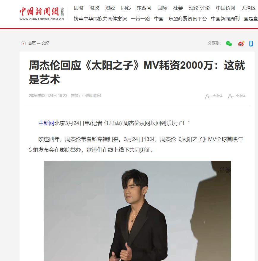 周杰伦回应《太阳之子》MV耗资2000万:这就是艺术——中国新闻网