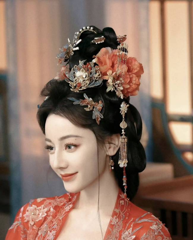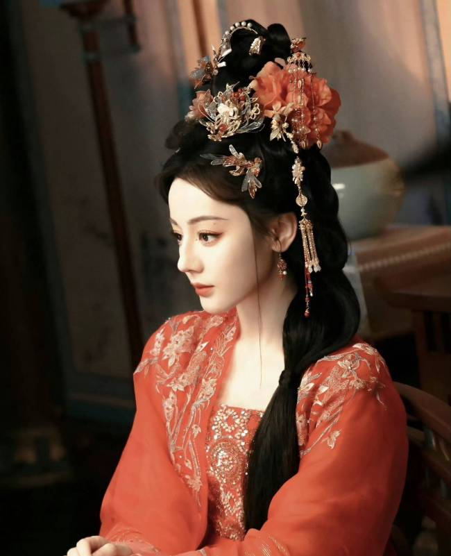 酒红长袍上缀满金色刺绣和琉璃珠,走动时珠玉轻响。头上繁复的发髻插满珍珠金簪,尽显古典风范。妆容方面,红黑撞色眼影配上颧骨鎏金高光,凸显了热巴立体的面部轮廓,明艳大气。剧中设定的白发紫瞳更添妩媚与冷感,完美诠释了“又妖又美”。