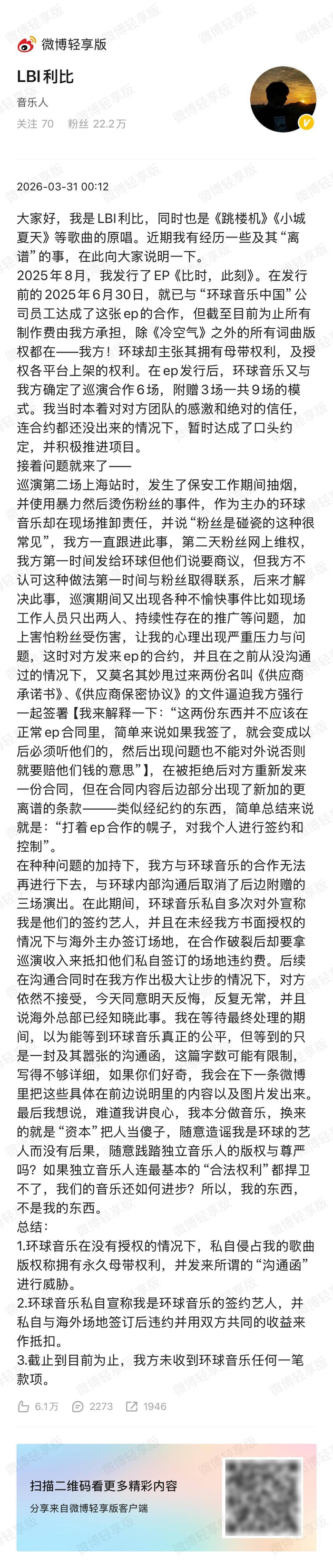 3月31日凌晨,《跳楼机》《小城夏天》等歌曲的原唱歌手LBI利比公开发布两条微博,共1300多字,控诉环球音乐中国。他在其中一条长文里写道,因版权侵占、巡演纠纷及霸王条款等问题“实在忍不下去了”。