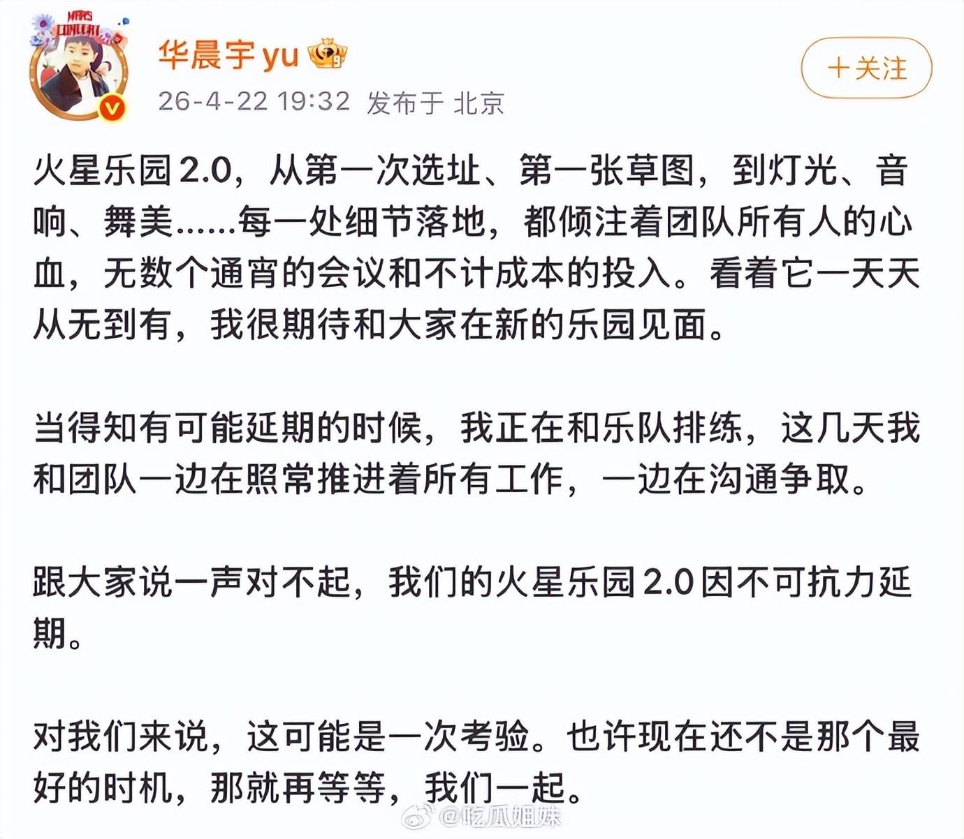 据网传消息,这场演唱会前期投入高达好几个亿,筹备了数年之久,甚至连场地都买了下来。华晨宇原本打算将其打造成一个集舞台、游乐园、住宿、咖啡厅、餐饮于一体的“火星乐园”——一个真正属于歌迷的沉浸式音乐王国。如今演出延期,舞台开拆,这笔损失可想而知。