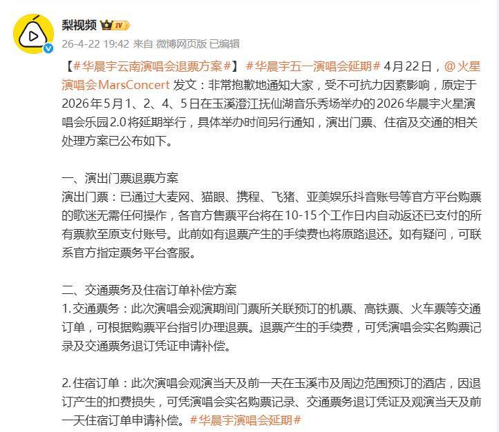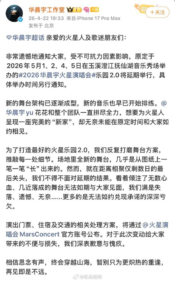“舞台已经搭好了,却唱不了了。”这句台词,成为了华晨宇和无数“火星人”心中最大的遗憾,关于“华晨宇演唱会场地开始拆了”的消息突然冲上热搜,瞬间让全网疯狂,前一天,华晨宇玉溪演唱会因不可抗力宣布延期,这个消息一出,立刻引发了全网的关注和热议。,据新浪音乐报道,当时的演唱会舞台已经完整搭建,一切准备就绪,却终究没能等来开唱的那一刻,真正让粉丝破防的,是22日晚的那场直播,当晚,华晨宇戴着墨镜现身直播间,试图用轻松的语气回应舞台延期的变故,但即便隔着屏幕,观众也能清晰感受到他声音里的哽咽,面对这突如其来的打击,他没有抱怨,反而第一时间贴心安抚歌迷:不用担心,所有已订的门票都会全额退款,连带着酒店、机票的退改签手续费,也全部由他承担。,一句“我来扛”,让不少网友直呼“太心疼了”,作为华语乐坛的顶流歌手,华晨宇的演唱会向来不只是演出,更是一场拉动地方经济的“文旅盛宴”,2025年底,他的“火星乐园”演唱会在海口举办,正好撞上Katy Perry的亚洲巡演,两场活动叠加,共吸引12.16万人次到场,带动综合经济收入高达8.31亿元,那段时间,海口市酒店入住率直接飙升至77%以上,免税店销售额更是暴涨近四成,堪称“一场演唱会带火一座城”的教科书级案例。,再往前看,去年华晨宇的火星演唱会在汤山音乐谷连演三天,仅两日就吸引了21.3万游客涌入汤山,消费热度肉眼可见地飙升,媒体评价称,这不仅刷新了观众的视听体验,更以文娱IP赋能城市经济,成了“演唱会+旅游”融合发展的新标杆,而这次玉溪演唱会的延期,牵动的远不止歌迷的心。,据网传消息,这场演唱会前期投入高达好几个亿,筹备了数年之久,甚至连场地都买了下来,华晨宇原本打算将其打造成一个集舞台、游乐园、住宿、咖啡厅、餐饮于一体的“火星乐园”——一个真正属于歌迷的沉浸式音乐王国,如今演出延期,舞台开拆,这笔损失可想而知。,在直播中,华晨宇虽难掩低落,却始终没有过多抱怨,他只是轻声告诉歌迷:“别担心,都会处理好的。”在这个舞台上,他或许暂时无法开口唱歌,但那份对歌迷的承诺,已经掷地有声。