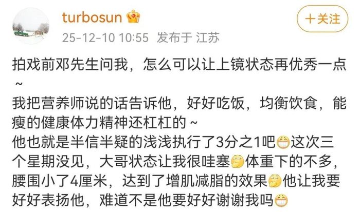 12月10日,孙俪在个人社交平台发文透露,邓超拍戏前问她,怎么可以让上镜状态再优秀一点。孙俪便把自己营养师说的话告诉他,“好好吃饭,均衡饮食,能瘦的健康,体力精神还杠杠的。”
