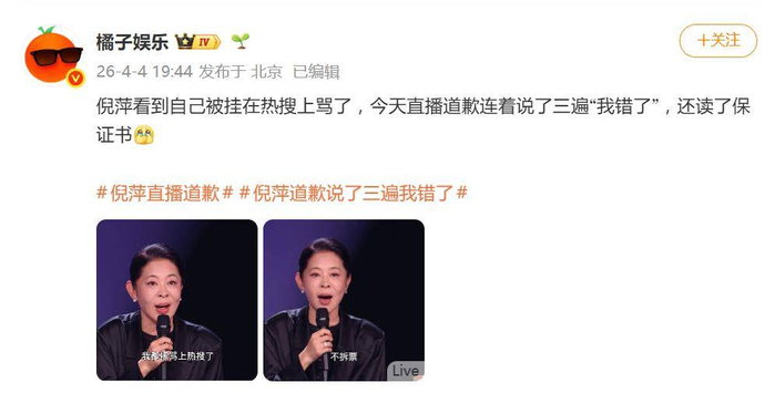 倪萍在《乘风2026》的初舞台直播中,由于人情味过于浓烈、屡次干预赛制,引发了广泛争议。次日一开场,她便以一场道歉三连和当众宣读保证书的举动,迅速成为4月4日舆论的焦点人物。