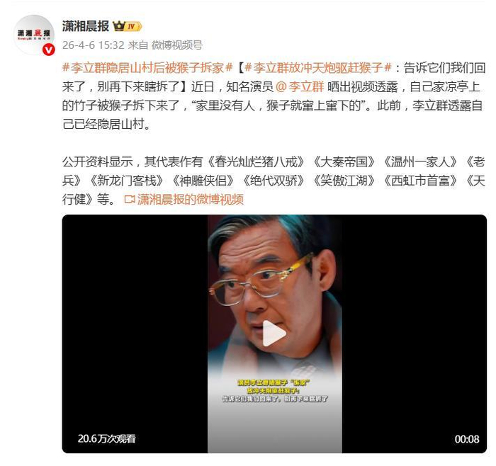 据悉,李立群此前已透露自己隐居山村生活。作为观众熟悉的老戏骨,他的代表作包括《春光灿烂猪八戒》《大秦帝国》《温州一家人》《老兵》《新龙门客栈》《神雕侠侣》《绝代双骄》《笑傲江湖》《西虹市首富》《天行健》等。如今,从荧幕上的帝王将相、江湖豪侠,到山野间与猴子“斗智斗勇”的普通住户,李立群这种回归质朴、幽默应对生活琐事的状态,反而让观众看到了另一种生动。