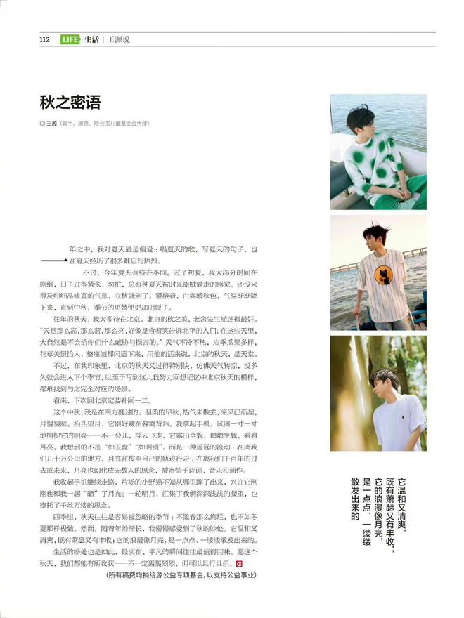 王源最新一篇《王源说——秋之密语》,其中描述了一小段王源偶遇片场的小猫的故事,还有一段浪漫的寄思,“一轮明月,汇集了我俩深深浅浅的凝望,也寄托了千丝万缕的思念”。好像是在说小猫和他对想念之人的思念。