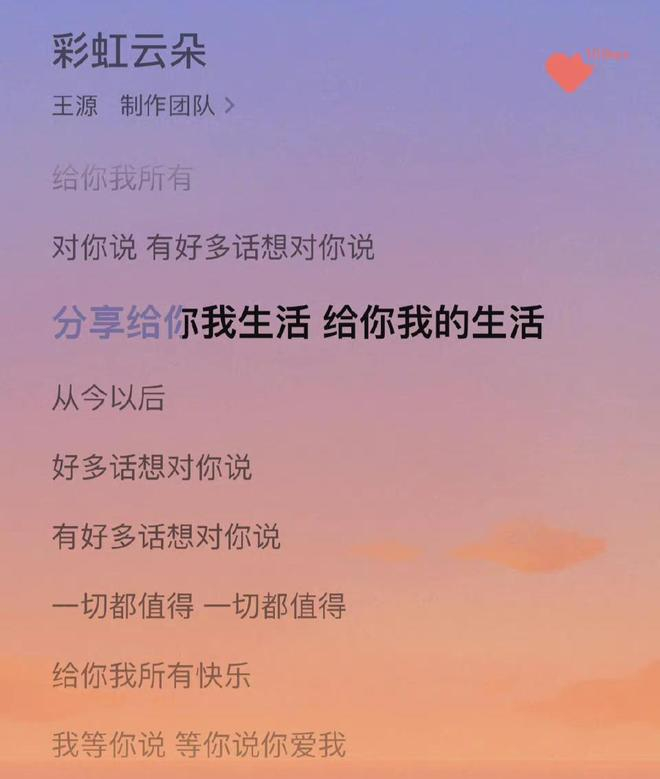 其实,王源对于这种小事的分享也是很看重的,在他作词的《彩虹云朵》中,就有这样一句话“分享给你我生活”。(本文由添福娱乐原创,抄袭必究)众所周知,《彩虹云朵》是王源写的一首小甜歌,有着他对于浪漫的设想。