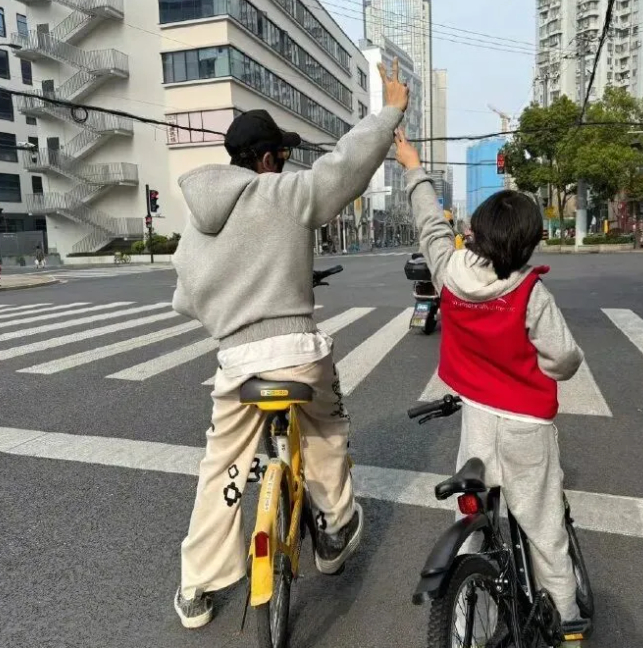 4月4日,黄晓明在微博晒出与9岁儿子的户外骑行照。照片里,他骑着共享单车,儿子骑着儿童自行车,两人在人行道前击掌合影,画面温馨自然。
