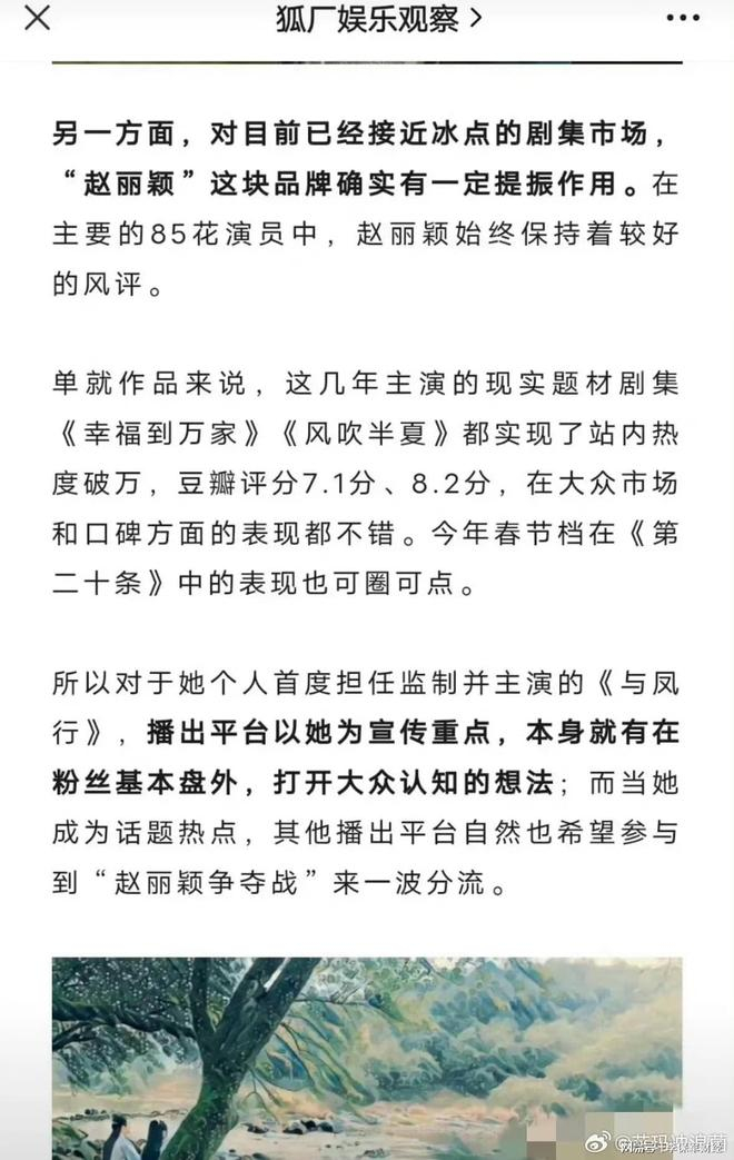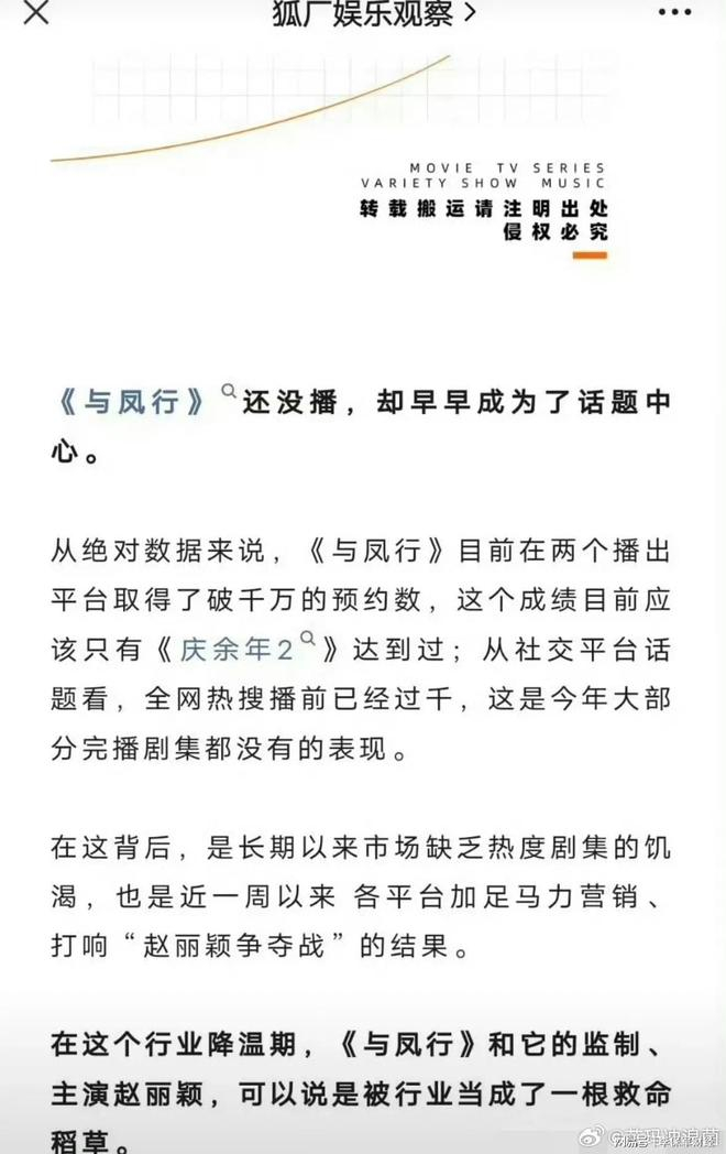 3月16日,媒体狐厂发文称:《与凤行》目前在两个播出平台腾讯视频和芒果TV取得了破千万的预约数,这是今年大部分完播剧集都没有的表现,《与凤行》和它的监制、主演赵丽颖,可以说是被行业当成了一根救命稻草!