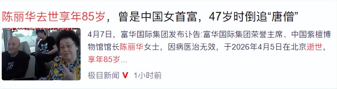 ## 85岁富商陈丽华去世,和老公互称董事长迟先生,百亿遗产早有安排,这不禁让人想到一句话:大戏怎么能收场?2026年4月5日,北京城一声叹息,富华国际集团荣誉主席、中国紫檀博物馆馆长陈丽华,走完了85年的传奇人生,这一消息传出,全网刷屏的不是她数百亿身家,不是她"紫檀女王"的赫赫威名,而是那个比她小11岁、陪她走过35年风雨的男人——迟重瑞,这个看似"卑微"的男人,竟用36年时间默默守护着这个足以让任何男人炫耀的女人。,说到这对看似"不平等"的婚姻,确实让人捧腹,1988年,《西游记》热播,迟重瑞饰演的唐僧温润儒雅,成为家喻户晓的人物,但当年有网友吐槽:"陈丽华看这唐僧不就是迟重瑞吗?"没想到这个"唐僧"竟是真实的"紫檀女王"的真命天子,两人的相识颇具戏剧性——在一场京剧票友会上,酷爱京剧的陈丽华和出身京剧世家的迟重瑞,因戏结缘。,199年,两人登记结婚,那个年代,"大款"的女朋友找"小白"男朋友,堪比今天的"富二代"和"富三代"的组合,但当时的外界声音更是"傍大款""老牛吃嫩草""各取所需",标签贴了一地,但谁能想到,36年后,这对看似"不合"的夫妻,竟能用"董事长"和"迟先生"互称,走出最幸福的人生。,婚后,外界看不懂他们的相处方式,但细节里藏着另一面:迟重瑞每晚为妻子泡安神茶,陪她吃泡面的日子;陈丽华斥资2亿建紫檀博物馆,让迟重瑞担任副馆长,这种"恩爱"不是普通人的爱,是用钱和地位来回报的爱,2013年,迟重瑞在《鲁豫有约》中谈及婚姻秘诀:"我感觉就是能够相互理解,她能够理解我,我能够理解她,我感觉俩人在一起就很幸福。"这话听得出,迟重瑞的幸福不在于金钱和地位,而在于这份相互理解。,陈丽华去世后,遗产分配成为外界关注的焦点,据多家媒体报道,陈丽华生前曾立下遗嘱:四个子女(三个亲生子女和一个养女)每人分得100亿元,剩余约180亿资产及紫檀博物馆归丈夫迟重瑞所有,这个遗产分配看似"厚此薄彼",实则藏着深意,陈丽华留给迟重瑞的,不只是钱财,更是她对他的用情,正如她在遗嘱中写道:"重瑞陪我吃糠咽菜的31年,比任何数字都珍贵。",迟重瑞曾公开回应遗产传闻:"我不需要这些钱,只希望妻子身体健康,长命百岁。"这句话让人心疼,但也透露出迟重瑞的真实想法:他不需要钱财,只需要与他最爱的女人在一起。,这对夫妻的故事,恰如其分地反驳了世俗对"女强男弱"婚姻的偏见,82岁的杨振宁娶了28岁的翁帆,21年婚姻里,翁帆放弃事业、照顾家庭、守着丈夫的规矩,没人说她"不自由",反而夸她"深情",而迟重瑞则被贴上"卑微"的标签,但如果换成迟重瑞,就成了"牺牲一生"、"终于解脱"。,这不禁让人思考:现代社会中,真正的爱是什么?是金钱和权力吗?还是简单的相互理解和陪伴?陈丽华和迟重瑞的故事告诉我们,爱不分贵贱高低,最珍贵的不是那些浮华的外表,而是内心的坚守与陪伴。,陈丽华走了,紫檀博物馆里,那些她耗尽毕生心血收藏的珍品还在,长安街上,她开发的地产还在,而迟重瑞,从38岁的盛年,陪到了73岁的白头,这对夫妻用自己的方式诠释了爱情:爱情就是默默陪伴,用自己最真诚的方式守护对方的人生。**吃瓜简评:一场跨越时空的爱情故事**,85岁的陈丽华,曾经被誉为“紫檀女王”,在这片土地上留下了一片浓墨重彩的印记,当她在2026年4月5日永远离开了人世时,全世界纷纷纷纷地讨论的,不是她数百亿身家的巨额遗产,也不是她在商业领域屡建屡创的传奇人生,而是那个比她小11岁、陪伴她走过36年风雨的男人——迟重瑞。,这段看似不可能的“老牛吃嫩草”婚姻,打破了人们对爱情的所有刻板印象,1988年,《西游记》热播,迟重瑞饰演的唐僧温润儒雅,瞬间成为家喻户晓的人物,而这时的他,47岁,正是陈丽华在香港创立富华国际集团的时期,两人相识颇具戏剧性——在一场京剧票友会上相遇,酷爱京剧的陈丽华和出身京剧世家的迟重瑞,因戏结缘。,婚后的日子,两人选择了截然不同的称谓方式:陈丽华称呼迟重瑞为“迟先生”,而迟重瑞则称妻子为“董事长”或“您”,这看似“卑微”的称谓背后,却藏着一段令人动容的爱情故事,迟重瑞每天为妻子泡安神茶,陪伴她度过漫长的夜晚;当陈丽华的二儿子企业陷入危机时,他甚至拿出珍藏的普洱茶打通关系,帮助公司渡过难关,陈丽华也用自己的方式回应这段感情,她斥资2亿建起中国紫檀博物馆,让迟重瑞担任副馆长,维护了他在外界的尊严。,这段看似“牺牲一生”的婚姻,却在外界眼中引发了无数争议,有人批评迟重瑞“吃软饭”,称他“卑微”“压抑”,但如果换成女性主角,事情就会完全不同,陈丽华的高调与独立在商场上却被称赞“深情佳话”,而迟重瑞的低调却被贴上“牺牲”的标签,这种性别偏见暴露了我们的世俗观念,也让人不禁思考:爱是不是不应该被世俗定义?,陈丽华用一生诠释了什么是真正的爱,她不仅是商界的巨擘,更是中国紫檀文化的传承者,1999年,她斥资2亿元在北京朝阳区建起了中国紫檀博物馆,这是中国第一家规模最大的紫檀雕刻艺术专题博物馆,正门使用了400多立方米木材,全部是纯木结构,指导工程的,是故宫博物院的木作专家,201年,她还启动了一项更大的工程——用紫檀和阴沉木,按1:10比例复制老北京“内九外七”16座城门,并捐赠给故宫博物院等世界知名博物馆,她说:“没有故宫没有今天,中国紫檀博物馆不是我的,是故宫的。”,在她离世后,外界的目光又一次聚焦