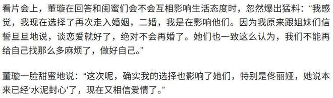 话说,她的好姐妹董璇跟她有相似的经历,都是圈内人,都离过婚,都有孩子。如今,董璇已经喜迎第二春,现任老公张维伊比她小9岁,俩人感觉挺幸福的。董璇还说,其再婚的决定对佟丽娅影响挺大的,本来她都水泥封心,现在又相信爱情了。