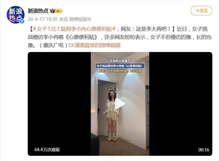 据4月17日报道,最近,一段模仿视频在网络上火了,火得连正主看了可能都得愣一下。一位重庆女子对李小冉在《乘风2026》中的《心愿便利贴》舞台进行了“像素级”复刻,从跑调唱腔到呆萌表情,模仿得形神兼备,被网友欢乐送上外号“李大再”。