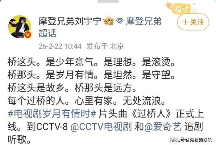 还应该看到的是,歌手刘宇宁在社交平台发文,他带来了电视剧《岁月有情时》片尾曲《过桥人》。歌手刘宇宁的音乐作品,非常优质!在春节期间,刘宇宁的歌声,充满温情与感动!“每个过桥的人。心里有家。无处流浪。”在春节期间,听到这样一首温馨的歌曲,令人回味无穷!