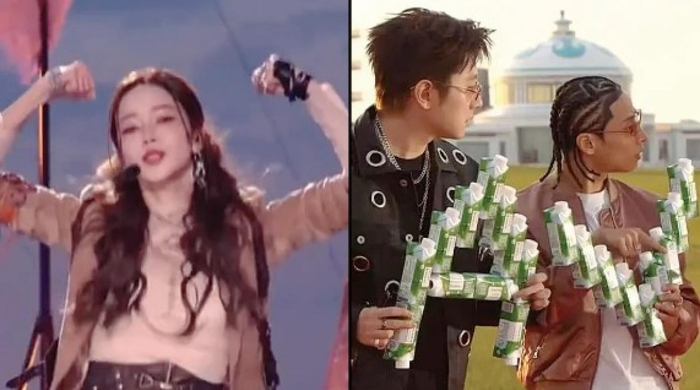(左)侯佩岑的舞蹈表现遭质疑划水。(右)VaVa星友应援团把VA拿成了AV。