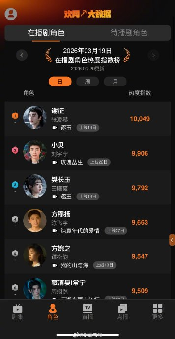 张凌赫凭借《逐玉》中“谢征”一角实现口碑跃升,连续多日蝉联在播剧角色热度榜首。其非科班但敬业的态度(如工科思维拆解剧本、为角色增肌晒黑)强化了观众信任,待播剧热度直接承接了《逐玉》的流量红利。