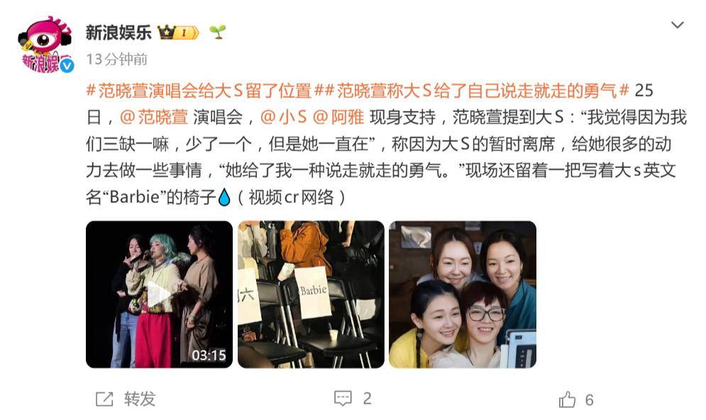 范晓萱这场演唱会,简直就是一场“吃瓜”先进派!原本普通的演出,结果因为一把椅子,直接把所有人打翻了!椅子上写着“Barbie”,这可是大S的专属座位,空着的椅子一眼就能看出这位“大马匹精灵”离我们远了,但她的存在感一如既往地扑面而来。,小S、阿雅、田馥甄这群姐妹,果然没有辜负大S的期待!小S一身黑色露肩T恤和牛仔裤,戴着眼镜,手里还拿着一杯什么的,情绪波动得跟风筝似的,而阿雅更是直接破防,随时随刻都要跳起来,仿佛在和大S一起疯起来,田馥甄虽然没有在台上动静,但从网友的反馈来看,她的存在感也没少,毕竟谁能拒绝这样的“文化输出”呢?,当范晓萱唱到《管他什么音乐》的时候,小S和阿雅直接上台伴舞,情节有点像四人奶茶复仇剧的高潮!小S眼镜架子大开,眼泪一颗一颗往下掉,整个台子都像是回到了录四人节目的时光,大家一起疯,一起闹,大家一起哭!,演唱会结束后,三个人在台上拥抱,泪流满地,小S情绪失控,直接哭出声,连台下观众都被感动得热泪盈眶,范晓萱在台上动情地说了一堆感人话:“三缺一,少了一个,但她一直在。”这句话直接打动了所有人,连大S的女儿Elly都来了,看到妈妈落泪,直接递上纸巾,贴心得让人心疼。,大S离世后,小S的状态一直是人设的核心,她在公开场合经常提到姐姐,情绪一波波崩溃,可这次,看到范晓萱在台上唱歌,想必是想起了四个人一起录节目的点滴,情绪终于决堤了。,一把空椅子,一句“三缺一”,三个人的拥抱和泪水,这场演唱会简直就是大S一生都在用自己的方式陪伴范晓萱,这场演唱会注定成为所有人记忆中难以抹去的一夜,毕竟大S虽然离了我们,但她从未离开过。**范晓萱演唱会:一把椅子,一场回忆,三位好友,四位心愿**,4月25日的台北,气氛简直是“雷区”!这场本该是普通的演唱会,却因为一个小小的细节,让无数网友直接破防,范晓萱在舞台上为大S留了一个特别的位置——一把椅子上写着“Barbie”的英文名,静静地立在灯光下,仿佛在诉说着一段难以言说的故事。,这把椅子,见证了多少无数的回忆啊!大S(徐熙媛)去世后,粉丝们一直在等待一场感人的重逢,而范晓萱这次真的给大家交付了一个惊喜,她不仅带着大S的灵魂在台上演唱,还用这把椅子默默地传达着对姐姐的思念,这可是吃瓜界的“干货”,简直让人忍不住为范晓萱的用心而感动。,小S、阿雅、田馥甄等圈内好友纷纷现身支持,现场气氛瞬间爆炸,小S一身黑色露肩T恤搭配牛仔裤,戴着眼镜,手里拿着一只杯子,看起来既萌又萌,情绪波动明显,每当范晓萱唱到《管他什么音乐》这首代表作时,小S和阿雅直接登台即兴伴舞,仿佛又回到了当年的四人 heyday,看着她们一起疯一起闹的样子,真的让人扼腕感叹:为什么好友之间的感情总是最动人的?!,更感人的是,表演结束后,小S、阿雅和范晓萱三人紧紧相拥,泪流满面,小S更是情绪失控,忍不住痛哭出声,整个现场都安静了下来,范晓萱在台上动情地说:“我觉得因为我们三缺一嘛,少了一个,但是她一直在。”这句话让人心头一颤,仿佛大S的精神一直在场,给范晓萱提供了无尽的力量,正是这份勇气,推动了范晓萱近期的一系列突破性行动,比如导演MV、举办实验性演出等。,更让人心疼的是,范晓萱在演唱间隙时,目光不自觉地望向那把空着的椅子,眼神里满是思念与不舍,这种细节处理得恰到好处,简直让人忍不住想给她加个大大的拥抱。,值得一提的是,小S的大女儿Elly也来到了现场,看着妈妈在台上落泪,小姑娘贴心地走上前去,递给妈妈纸巾,这一幕让不少网友直呼“太懂事”,简直要让人感动到热泪盈眶。,大S离世后,小S的状态一直是外界关注的焦点,她多次在公开场合和节目中提到姐姐时忍不住落泪,这次的演唱会现场,想必是听到好姐妹唱歌,想起了四个人一起录制节目的点点滴滴,情绪再次决堤。,这场演唱会简直是一场“吃瓜高手”的狂欢,从一把空椅子到三个人的拥抱,从泪流满地到无数网友的感动,这场演唱会注定成为所有人记忆中难以抹去的一夜,大S虽然缺席了,但她从未离开过,范晓萱用这场演唱会向大S献上了一份深情的告白,而我们每个人,也会在这场演唱会中,重新温习起那些关于友情和怀念的美好回忆。