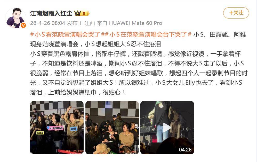 大S离世后,小S的状态一直是外界关注的焦点。她多次在公开场合和节目中提到姐姐时忍不住落泪,这次的演唱会现场,想必是听到好姐妹唱歌,想起了四个人一起录制节目的点点滴滴,情绪再次决堤。