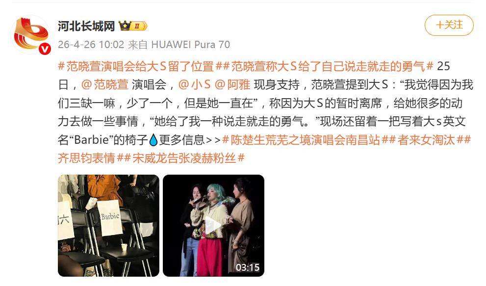 据4月26日报道,4月25日,范晓萱在台北举办演唱会,这场原本普通的演出,却因为一个细节让无数网友破防——舞台上,一把椅背上写着英文名“Barbie”的椅子,静静立在灯光下,那是她为已故挚友大S(徐熙媛)预留的专属座位。