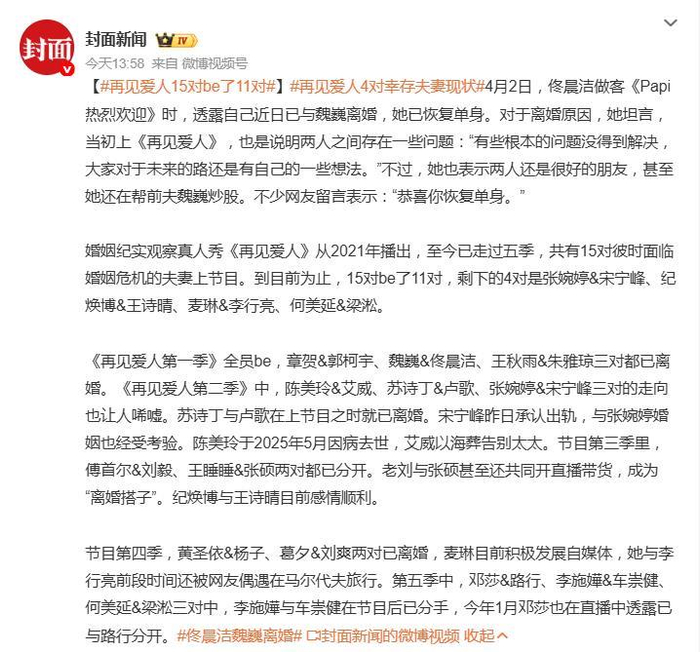 **又一离婚则何其常?《再见爱人》给爱情注解**,佟晨洁在访谈节目中曝出与前夫魏巍离婚,消息一出,网友们纷纷“恭喜”这对“离婚高手”,这场离婚仿佛是一场预言:自从《再见爱人》第一季播出,节目中的15对夫妻中,已经有11对“be”了,存活率低得惊人,堪称“国产婚姻最强预言家”。,让我们一起来盘盘这档“婚姻魔咒”节目的离婚名单吧!,**第一季:全军覆没**,节目刚开播,章贺、郭柯宇、王秋雨、朱雅琼、傅首尔、刘毅、王睡睡、张硕、刘爽、黄圣依、杨子、葛夕、麦琳、李行亮,还有当年的佟晨洁和魏巍,统统“be”了,看来《再见爱人》一开,爱情界就知道了,这档节目简直是“婚姻预言大师”。,**第二季:离婚潮连连**,苏诗丁和卢歌早就分开了,陈美玲和艾威的离婚更是一场戏,陈美玲在节目后不久就病逝了,艾威则在她的墓前海葬,这场离婚堪称“爱情至暗时刻”,还有张婉婷和宋宁峰的组合,宋宁峰出轨,张婉婷只能风雨飘摇,看来,第二季的离婚潮可不止一场。,**第三季:离婚搭子崛起**,傅首尔和刘毅、王睡睡和张硕都“be”了,更有意思的是,刘毅和张硕组成了“离婚搭子”,一起开直播带货,目前第三季还剩下纪焕博和王诗晴一对,感情顺利,但别人都“be”了,纪焕博是不是也快要“be”了?,**第四季:离婚继续**,黄圣依和杨子、葛夕和刘爽都离婚了,麦琳和李行亮虽然还在,但麦琳已经转型自媒体,两人前段时间还被拍到在马尔代夫旅行,关系成谜,看来,第四季的离婚继续,节目规律如故。,**第五季:离婚潮再来**,李施嬅和车崇健、邓莎和路行都分开了,目前第五季还剩下何美延和梁淞一对,存活情况不明,看来,第五季的离婚潮也没停下。,**再见爱人,爱人再见**,《再见爱人》不仅是一个婚姻纪实观察节目,更是一面照见婚姻复杂的镜子,从生死离别到出轨风波,从和平分手到另类合伙,节目里的夫妻们经历了无数波折,节目名字“再见爱人”一语双关,对多数嘉宾而言,的确是“再见(再次相见)”和“再见(告别)”的双重预言。,当一档节目成为婚姻结局的“高能剧透”,观众看的早已不只是别人的故事,更是一面映照现实的镜子,下一对走进节目的夫妻,恐怕得先掂量一下这个“魔咒”的份量了,毕竟,爱情的不确定性,谁都没说过不会“be”。