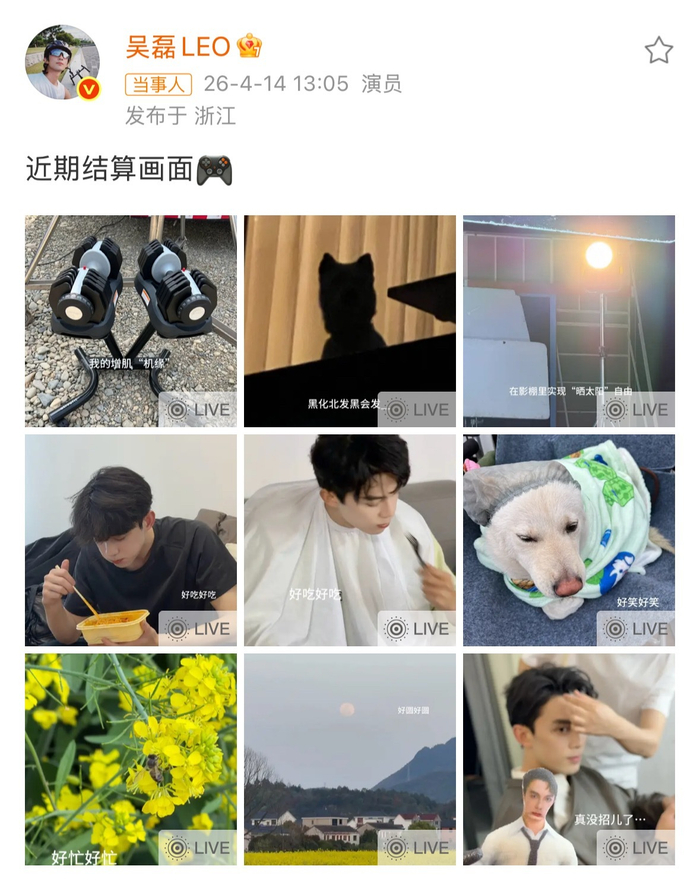 吴磊晒了9宫格live照,好有活人感的日常,增肌、吃饭、拍戏、小北,吴磊的生活简单又幸福