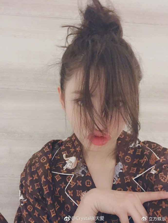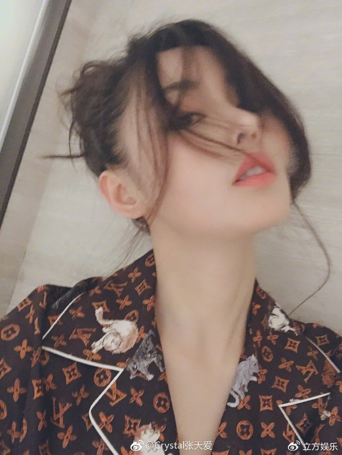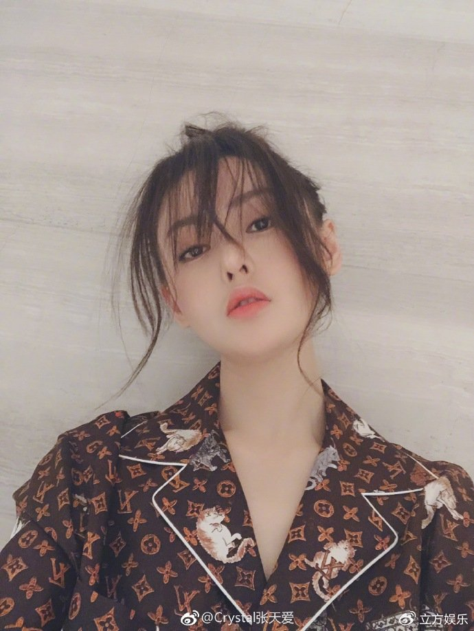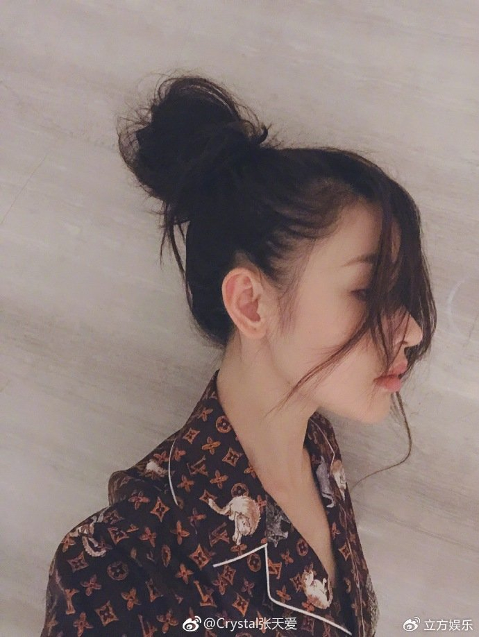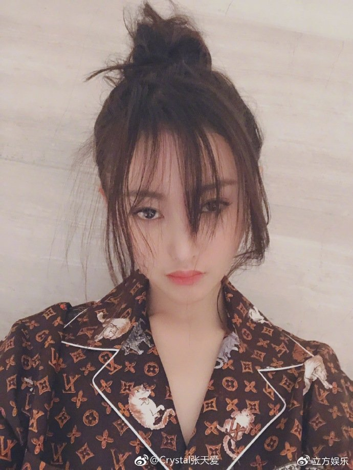 张天爱绑着丸子头,长长的刘海随意散落却依然无法抵挡住美貌,十分妩媚吸睛。