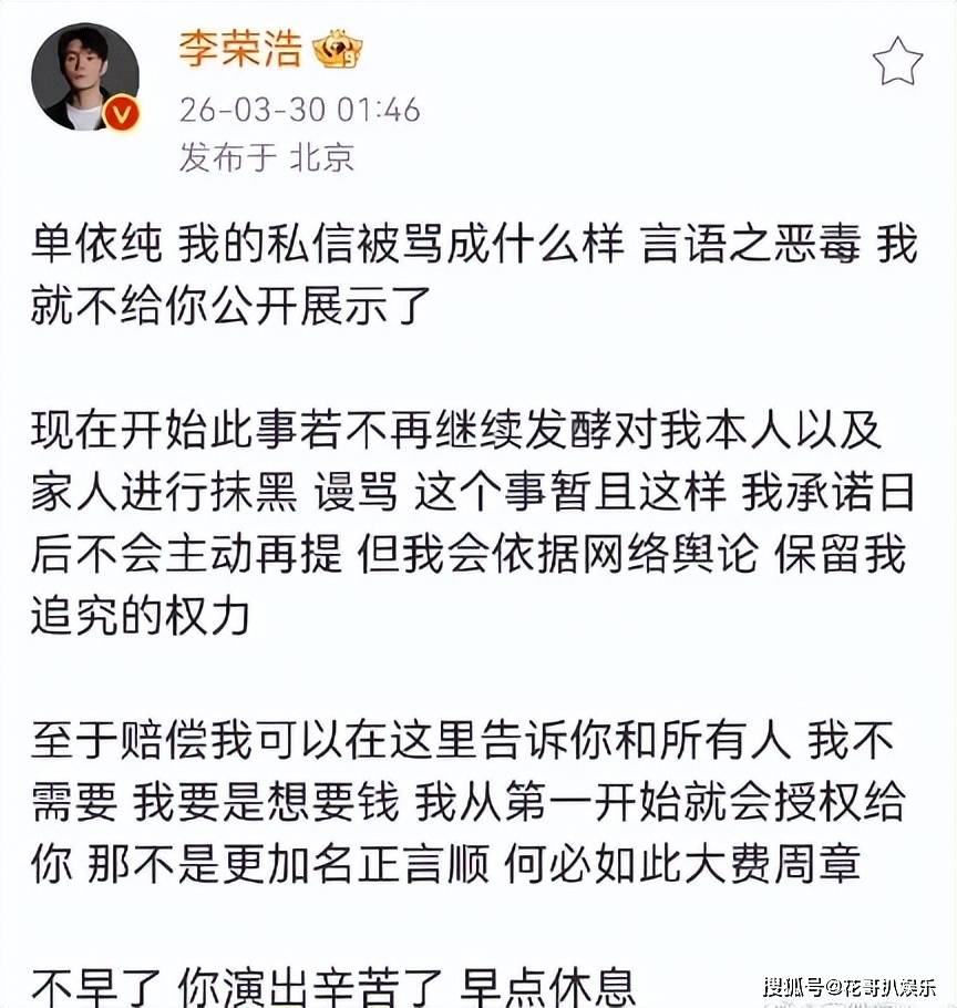 这边李荣浩也很快回应了,说自己不需要任何赔偿,但要求单依纯的粉丝停止对自己和家人的骚扰和网络暴力。此事到此为止,但是如果网络舆论再发酵,对自己和家人造成伤害,他一定会追究。显然李荣浩也想到此为止了,他也算是体面人,没有不依不饶追究下去。