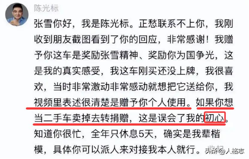 陈光标先是紧急澄清——我这车是奖励爱国精神,是只供张雪个人使用的,是不能转售转赠的,你张雪那么做就是“误会了初心”……