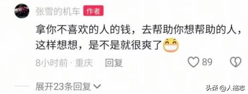 他最得劲的是这句:“拿你不喜欢的人的钱,去帮助你想帮助的人,这样想想是不是就很爽了”。