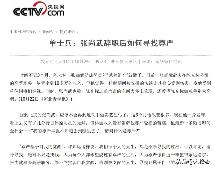 这个事,我写的是一个叫张尚武的前体操世界冠军,伤了混下去后,在北京地下道卖艺乞讨,引起舆论关注,结果,这事也被陈光标嗅到商机了。
