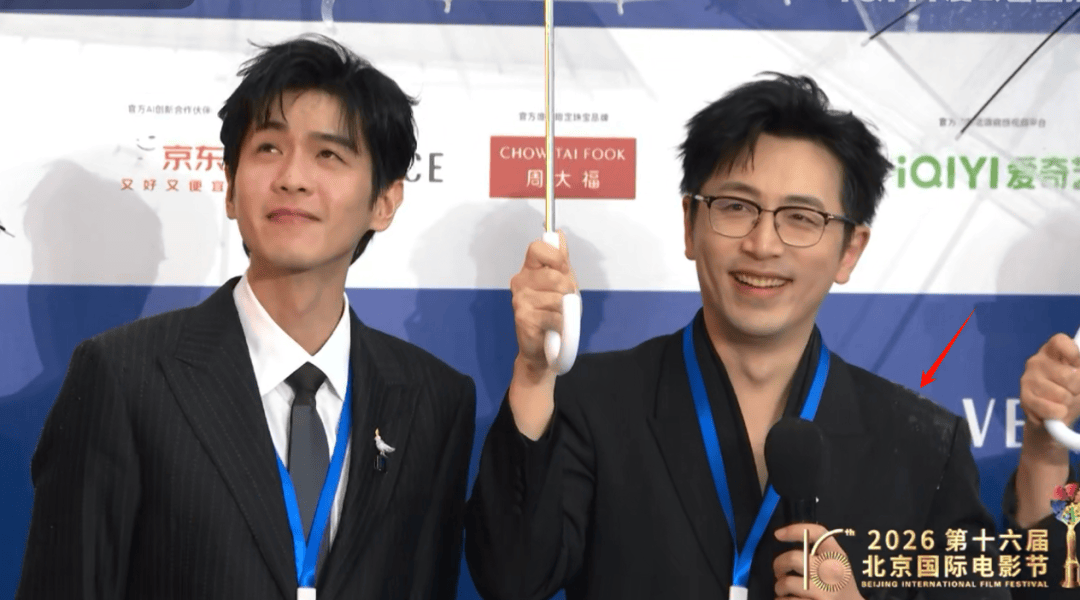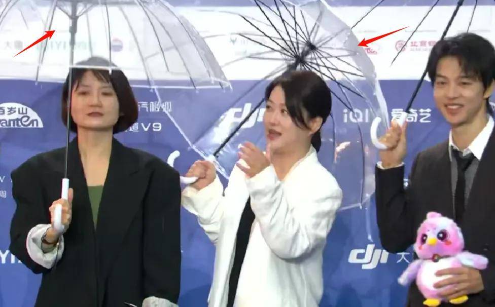 但有的人打伞似乎只关注自己,逼得旁边的制片人、编剧应萝佳雨伞都斜着打了,后来更是直接把自己的伞放到了身后,但两边的人似乎都无动于衷,
