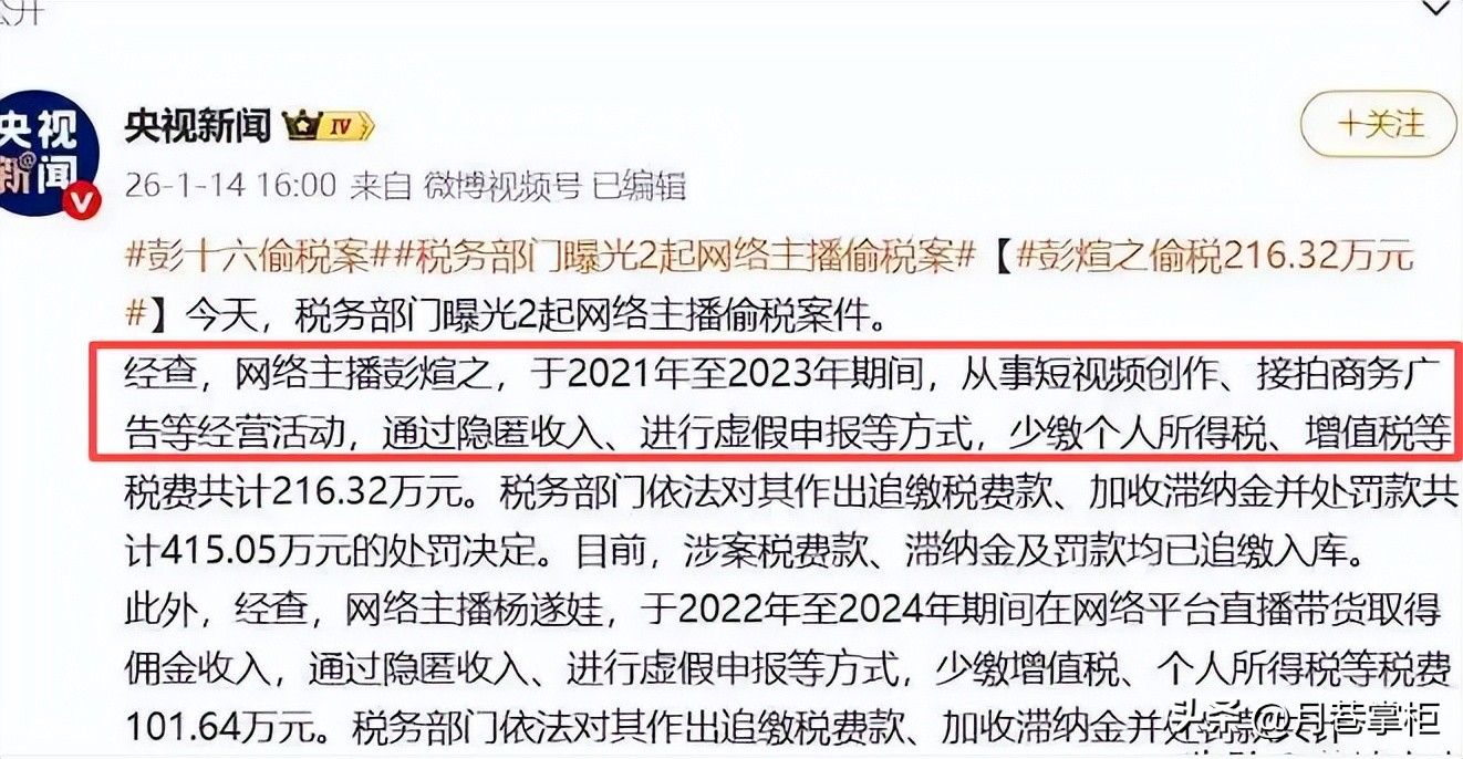 **吃瓜简评:顶流网红彭十六偷税被查,罚款415万,掉粉12万还不算完** ,姐妹们!这波事儿真是揪心又好笑!顶流网红彭十六,光光是网红界的“巨无霸”,粉丝数更多于某些明星的总和,随便一个广告都能进账55万,年收入简直不要太离谱!然而呢?这位“白月光”倒是把“偷税漏税”玩得溜溜core,结果惹得连税务大哥都翻脸了,处罚力度简直过核!这事儿,堪称“网红界的教训大课堂”! ,### **偷税漏税:一场“白月光”狂欢的终结** ,说到彭十六,这位姐姐可是网红圈的“老字号”,早年凭借古风变装,视频一出,全网疯狂追捧,粉丝量直接飙升到300万+,视频点赞量也经常稳定在百万级别!商业价值?放眼全网,简直是“无敌”级别!广告报价高到让人窒息,线下演出、音乐创作、品牌合作,年收入直接数千万,简直就是“印钞机”光速运转! ,然而呢?这位“白月光”在纳税这块儿,可真是“把握不好",按照重庆税务部门的数据,2021年到2023年,彭十六自行申报的税费加起来才160万,光2022年就只有11.05万!这笔钱,简直比她一个广告的报价还少一半!更可怜的是,单单一周接的广告收入,就能到达160万税费总额,税务部门一查,就直接触发了税收大数据的预警。 ,### **“偷税漏税”:一场“遮羞布”大戏** ,为了在税务这场“生死对决”中脱身,彭十六可谓是下了不少功夫,她注册了一家名叫“彭煊商务信息咨询”的个体工商户,名义上是用来核算她的广告收入,但实际上却成了她偷逃税款的“遮羞布”,这家公司从来没有正经员工,更别说规范的财务和账簿了,资金收付也毫无章法,简直就是一场“乱七八糟”的财务闹剧。 ,更绝的是,彭十六还玩起了“虚开支出”的把戏,在2021年申报经营所得时,她虚列了96万元的成本支出,可当税务部门要求提供相关凭证和发票时,她却拿不出任何东西,甚至连这笔钱具体用在哪儿,她都说不清白,明摆着是在造假,想少缴税款。 ,除了虚开支出,彭十六还玩起了“私账收款”的游戏,线下商演、音乐创作等收入的劳务报酬,她从不让对方公对公转账,而是直接打入自己的私人银行卡,三年间,她通过这种方式收款总共905万元,其中540万元根本没申报纳税,这些私人账户的交易明细,足有上万条,税务工作人员为了核对这些数据,花了好几个月的时间。 ,### **税务调查:一场“铁证如山”的大戏** ,一开始,彭十六还心存侥幸,觉得自己藏得很好,随着调查深入,越来越多的“铁证”被扒出来,面对铁证如山的证据链,彭十六一开始还拒不承认,直到被迫低头认罪。 ,然而呢?这位“天使”偷税的行为,远不止于“少报收入”那么简单,根据官方披露,彭十六早在2019年10月就注册了这家个体工商户,名义上是核算广告收入,实质上却成了她偷逃税款的“替身”。 ,### **处罚与惩戒:一场“杀鸡儆猴”大戏** ,税务部门在2026年1月正式曝光此事,此时的彭十六,已经触发了税收大数据的红线,税务部门也掌握了足够的证据,2025年11月,税务部门就已经下了处罚决定,但直到2026年才正式公布。 ,根据处罚公告,彭十六因少缴税费216.32万元,被依法追缴税款,外加收滞纳金并处罚款,合计高达415.05万元,彭十六已经将这笔钱全部缴清入库。 ,然而呢?处罚的背后,更是一场“杀鸡儆猴”的大戏,彭十六的账号在多个平台被封禁,抖音平台更是掉粉了12.8万,且还在持续下滑,对于网红来说,账号就是生命,掉粉禁言意味着商业价值暴跌,变现能力直接下降。 ,### **教训与反思:网红们别以为自己是“白月光”** ,这场“偷税被查”的闹剧,简直就是网红圈的“惊心动魄”大戏,彭十六年入千万,却因为偷税漏税,整个人栽了个大雷,其实呢?这位姐姐的下场,根本不值得怜悯,年入千万的她,明明有能力合法纳税,却偏偏选择了走捷径,抱着侥幸心理,觉得自己是顶流就可以钻法律的空子。 ,然而呢?税务红线任何人都不能触碰,不管你是顶流网红,还是普通小白,都是如此,这场交易,既是对彭十六的警告,也是对整个网红圈的提醒。 ,### **偷税漏税的代价** ,说到底,这场“偷税被查”的闹剧,不仅仅是一位网红的个人悲剧,更是整个网红圈的一次警示,流量再大,也不能凌驾于法律之上;收入再高,也不能忘记自己的公民义务,希望所有网红都能从彭十六这场事中学到教训,主动依法纳税,守住法律底线。 ,你才能在这个行业里长久发展,才能真正赢得网友的尊重,否则?就像彭十六那样,终有一天,你也会栽得像只白菜似的,掉粉、禁言、倾家荡产,真是“惨不忍睹”! ,**吃瓜完毕!**