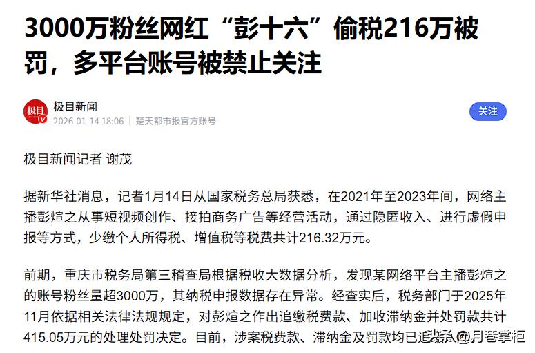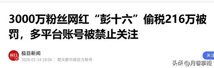 极目新闻——3000万粉丝网红“彭十六”偷税216万被罚,多平台账号被禁止关注